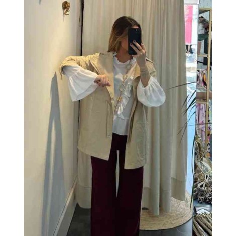 La chaqueta cortavientos Vera es la prenda ideal para los días de otoño, combinando estilo y funcionalidad. Confeccionada en tejido ligero en tono beig, cuenta con solapas en el cuello que aportan un toque elegante y una cinta ajustable en la cintura para un ajuste personalizado.