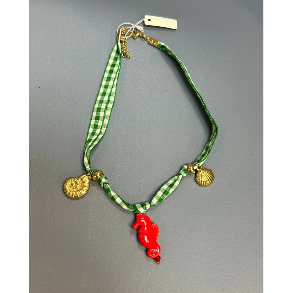 Colgante con charms de inspiración veraniega y marina, montado sobre cinta de tela vichy. Un accesorio fresco, divertido y con mucho encanto, perfecto para completar tus looks de verano con un toque original.